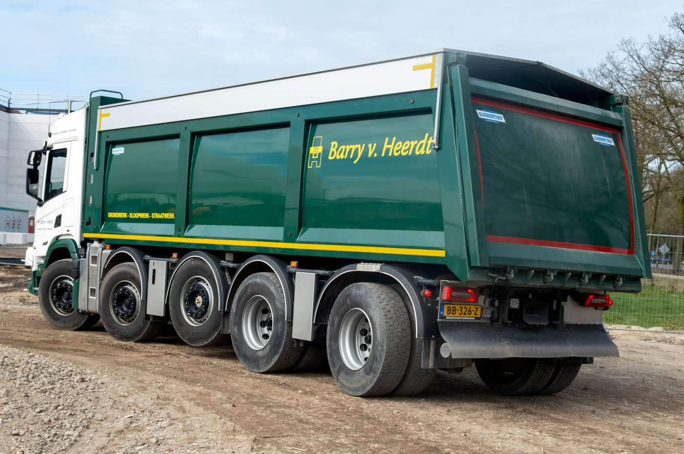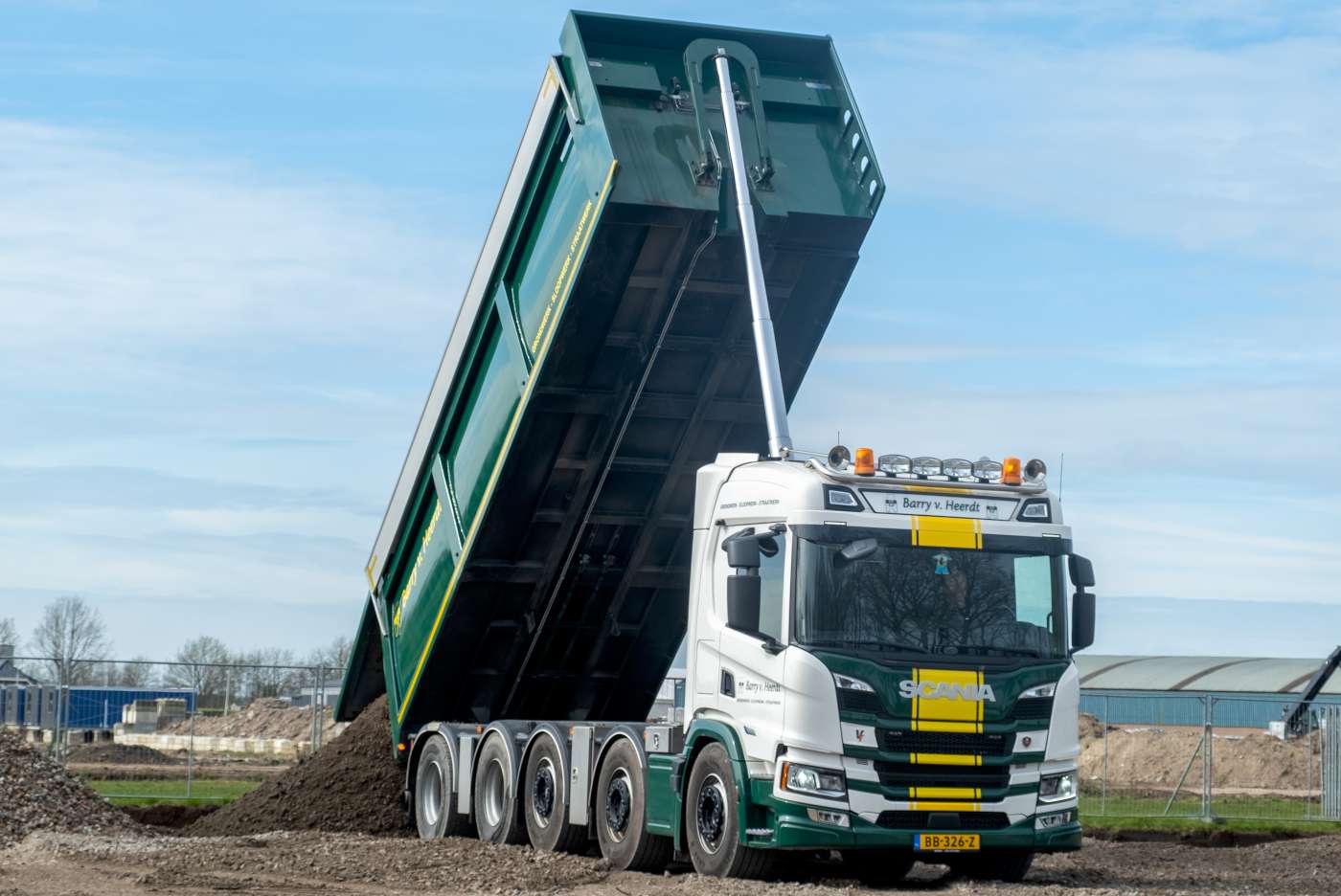De Scania 13 liter staat al bekend om zijn zuinig brandstofverbruik, maar in combinatie met enkele reductie achterassen wordt dit geoptimaliseerd. Barry van Heerdt koos voor deze combinatie omdat het kipperwerk steeds meer over langere afstand gebeurt en het terreinwerk steeds minder wordt door het toepassen van rijplaten. Voor meer tractie kan de derde as tot 30 km/u gelift worden en beschikt de Scania natuurlijk over dwars- en langssperren. Met de door Veldhuizen Trucks gebouwde 50 tons 10x4 ontstaat er een truck die geschikt is voor gemengd gebruik. Door de toepassing van luchtvering is er een laag chassis, waardoor de Gijsbertsen kipper laag opgebouwd kan worden en ontstaat er tevens een laag zwaartepunt. Compleet opgebouwd met kipper heeft de Scania een indrukwekkend laadvermogen van 31,5 ton.