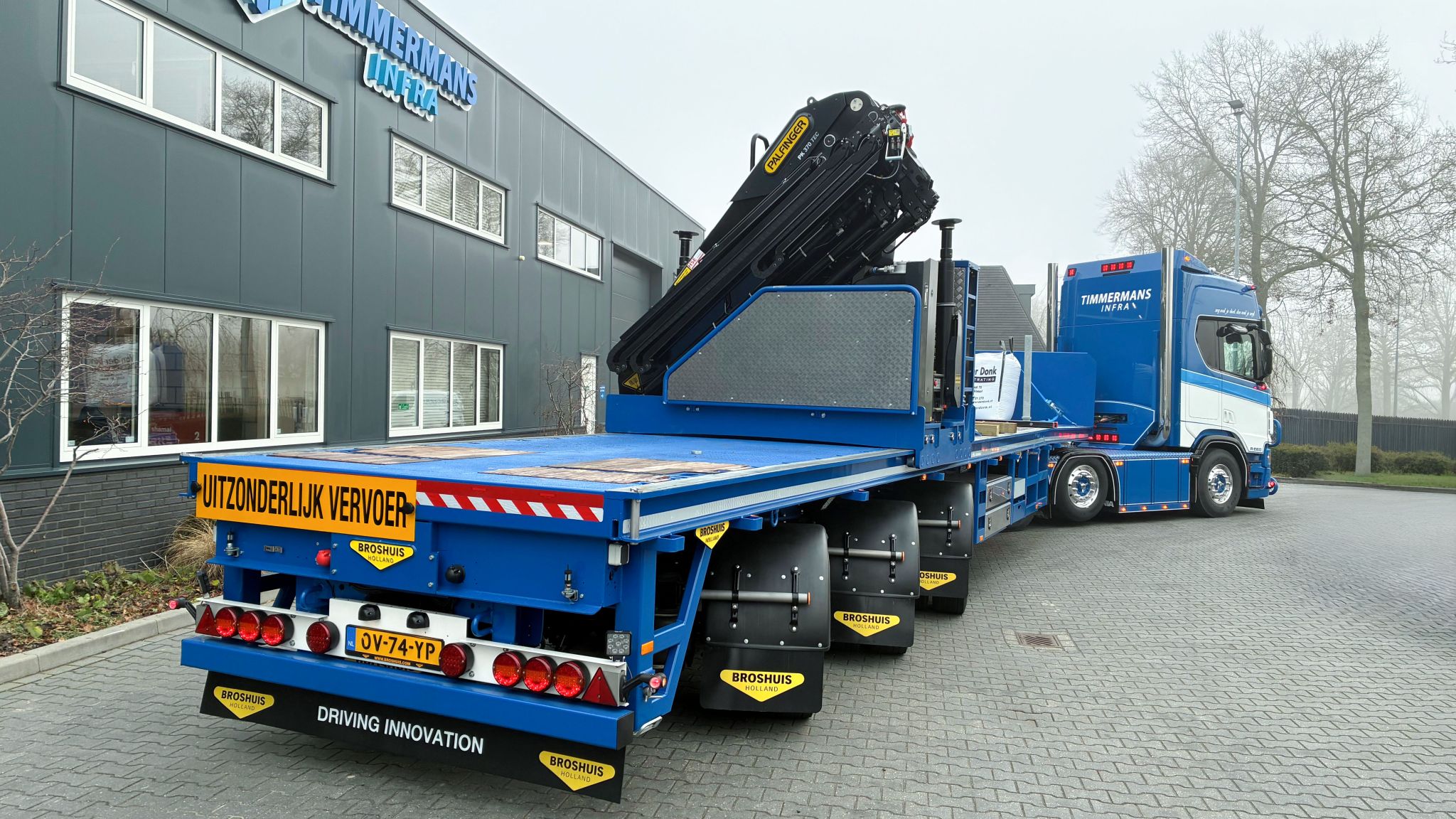 Timmermans Infra heeft twee nieuwe Broshuis trailers in gebruik genomen. Eén daarvan is een oplegger met daarop een volledig elektrische Palfinger PK370 TEC D rollerkraan van 37 ton/meter.