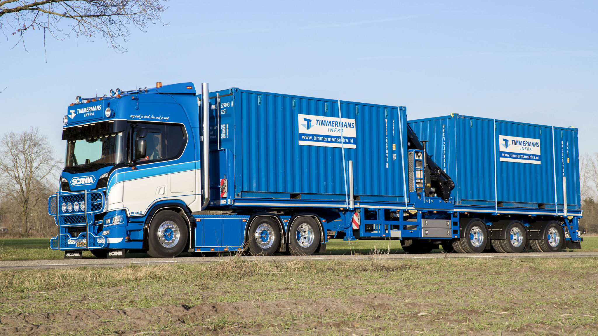 Daarnaast nam Timmermans Infra een 4-assige semi dieplader met wielkuilen en oprijkleppen in gebruik. Deze enkel uitschuifbare trailer is, net als de vlakke kraantrailer, uitgevoerd met hydraulisch gestuurde assen. Ondanks de lengtes en breedtes van beide trailers is wendbaarheid gegarandeerd. De semi wordt ingezet voor het transport van mobiele kranen, boormachines en big bags bentoniet, een essentieel product bij gestuurd boren.