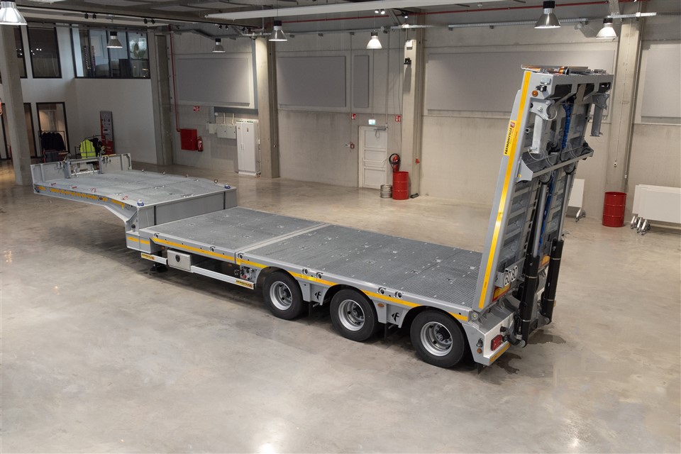 De oprijhoek van de klep is slechts 9 graden, zelfs met lage bodemvrijheid. Het oppervlak is een rooster, dat bijdraagt aan een aanzienlijke gewichtsreductie. De Flip-Tail laadklep is optimaal voor het op- en neer rijden van machines met massieve rubberen banden. Talrijke bevestigingspunten zorgen voor een veilige verankering van de machines tijdens transport. De hydraulische klepverlenging is driedelig en kan in slechts een paar eenvoudige stappen worden aangepast aan de breedte van de laadklep. Alle hydraulische functies worden bediend met een afstandsbediening.