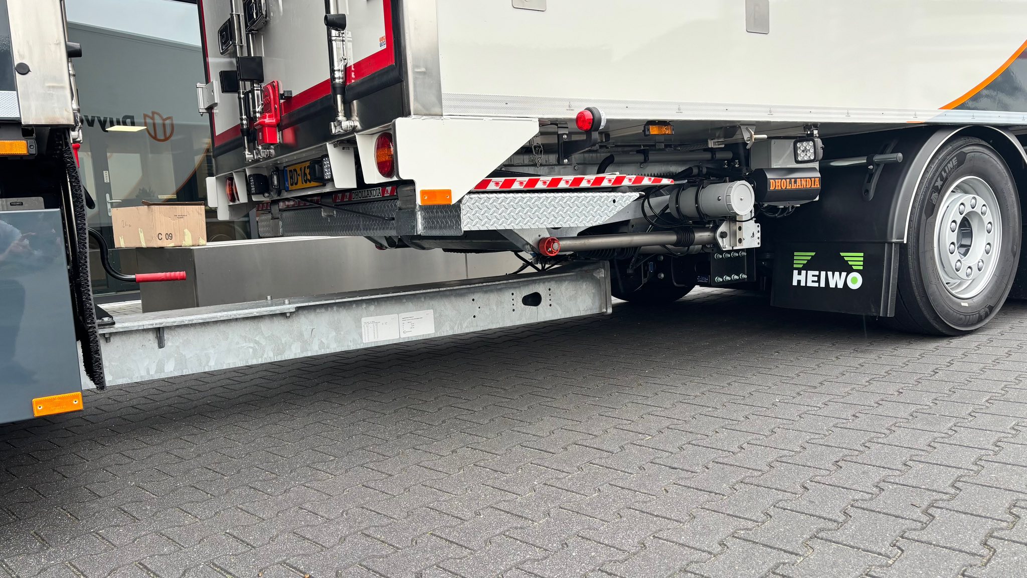 De middenas- aanhangwagen beschikt over een halve doorlaadmogelijkheid aan de voorzijde, wat het mogelijk maakt om gemakkelijk tussen truck en aanhangwagen door te laden. Daarnaast is deze voorzien van een SBS BDL-slot. Het volledige spuitwerk is verzorgd door Heiwo Coating.