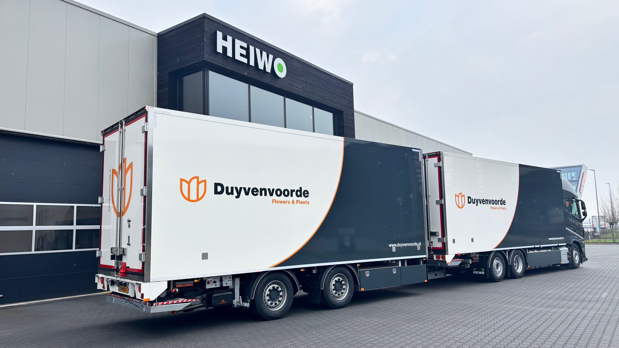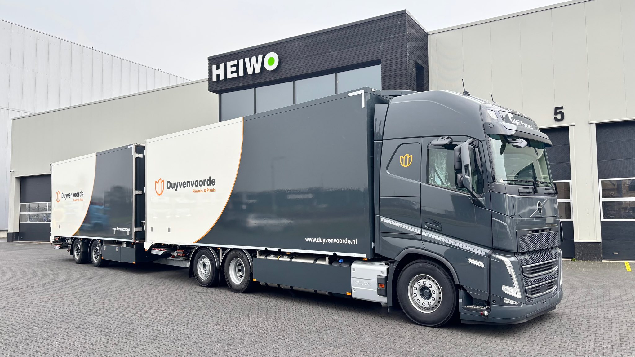 Heiwo heeft voor M&S Transport / Van Duyvenvoorde Flowers & Plants in Honselersdijk een combinatie opgebouwd op basis van een Volvo FH.