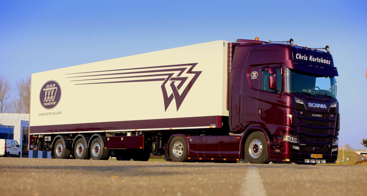 Chris Kortekaas heeft een nieuwe Heiwo oplegger laten bouwen die geschikt is voor 23 veilingkarren. Dat werd mogelijk door een speciaal kopschot. De oplegger werd uitgevoerd in de fraaie huisstijl van Cris Kortekaas.