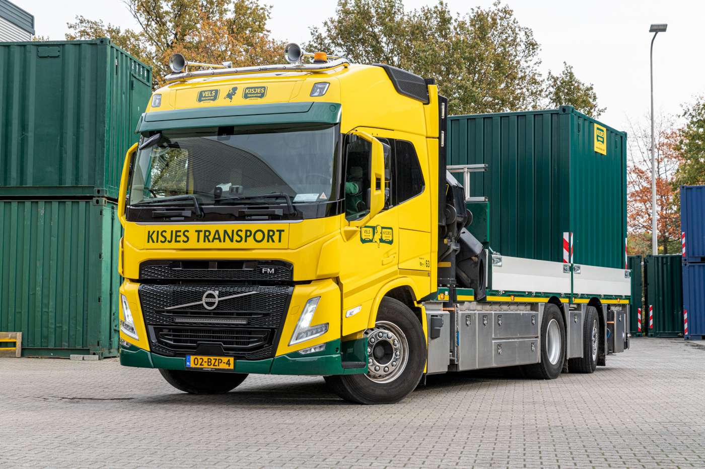 Kisjes Transport heeft een Volvo FM 500 6x2 bakwagen door HSE uit Vaassen laten voorzien van een Palfinger 53 Ton/meter autolaadkraan en een carrosserie.