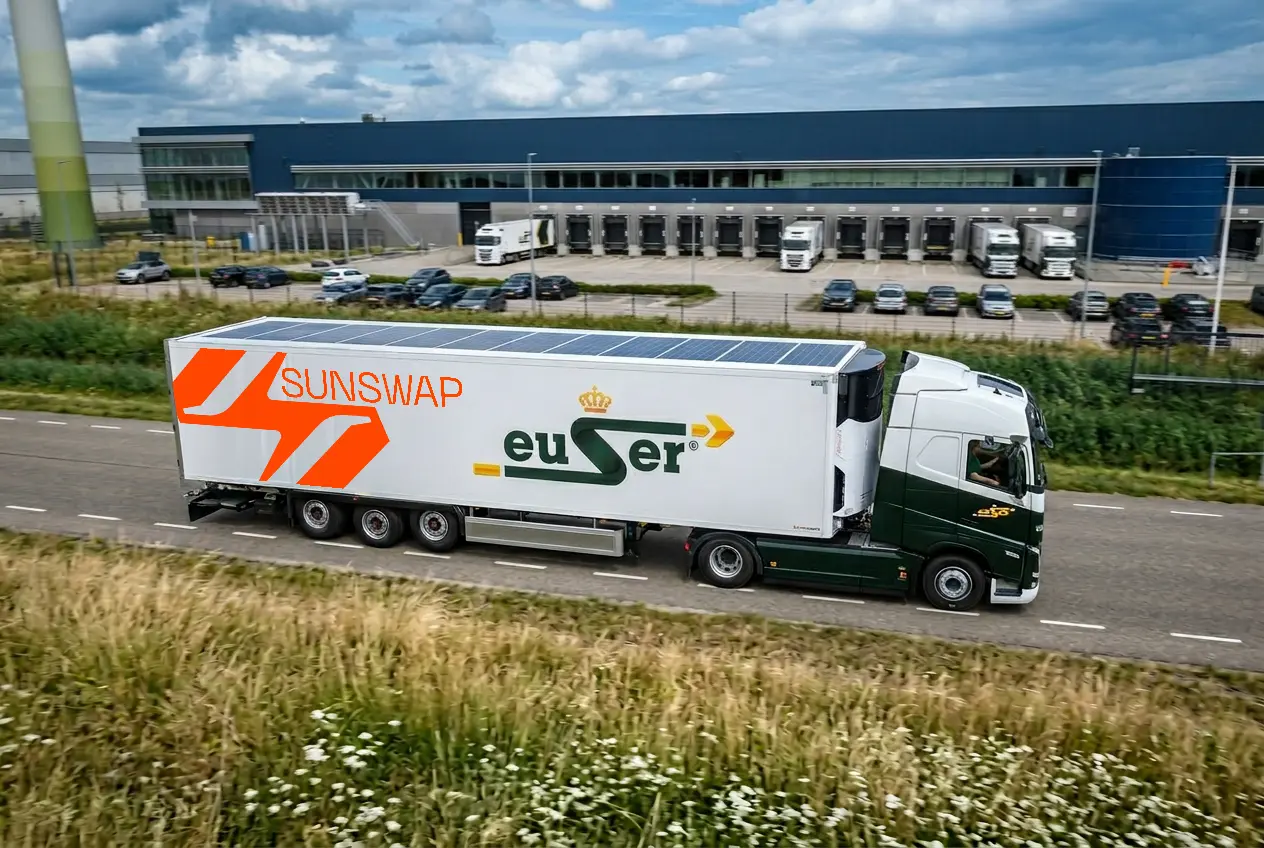 Sunswap is de naam van een nieuw ontwerp van een elektrische koelunit. Een koelmotor zonder verbrandingsmotor dus, gevoed door twaalf zonnepanelen op het dak van de oplegger. Euser test het systeem in Nederland, maar ook in het VK en in Australië lopen testen.